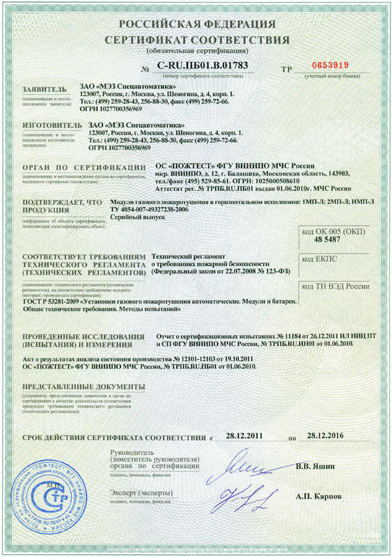 Модули газового пожаротушения типа: 1МП-Л, 2МП-Л, ИМП-Л